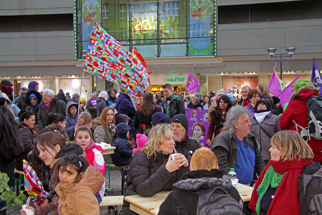 Trotz Eiseskälte hörten um die 200 TeilnehmerInnen den vielfältigen Reden zu, beteiligten sich, diskutierten, genossen die Saxophonmusik von Kristina Mohr, Kaffee-und Kuchen am Kumpel- und Kerle-Stand, informierten sich an den Ständen, tanzten „Break the chain“ mit den Mädchen-Dancers von „Open your Eyes“ und „Halay“ mit den kurdischen Frauen.